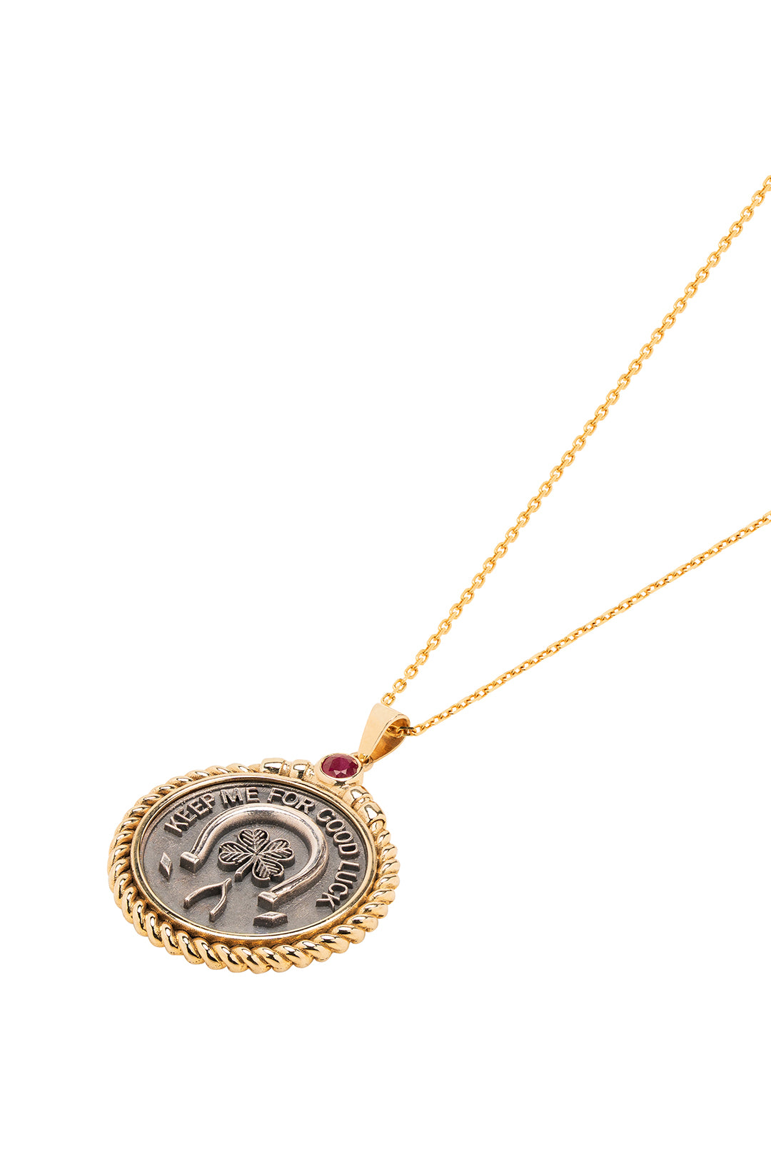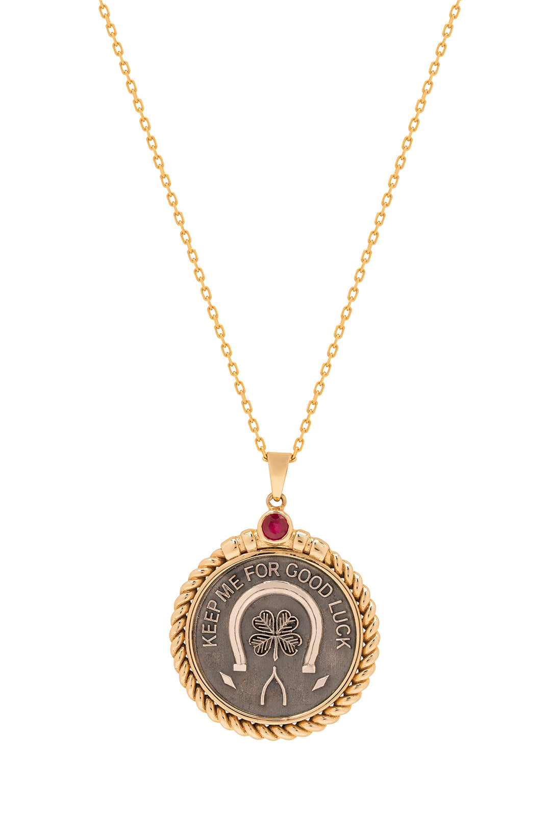 Carry your luck wherever you go with the Good Luck Keepsake Pendant, featuring a sterling silver coin engraved with a horseshoe, clover, and wishbone. The coin is elegantly framed in 18k yellow gold, crowned with a vibrant ruby as the central accent.