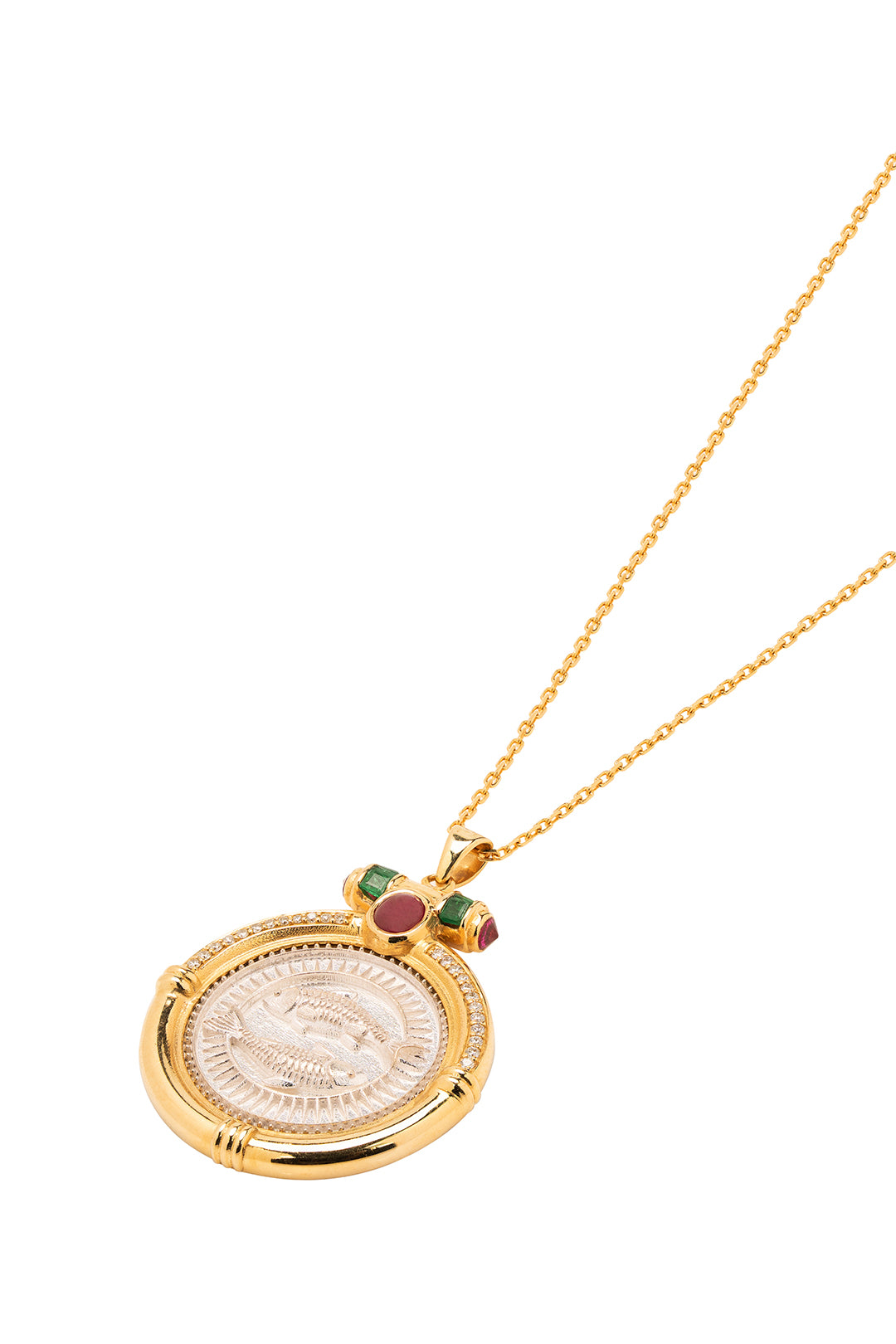 Celebrate your intuitive spirit with our Pisces Pendant, featuring a sterling silver coin engraved with the celestial two-fish symbol. The coin is embraced by a radiant gold frame pavé-set with diamonds, crowned with vibrant emeralds and rubies.
